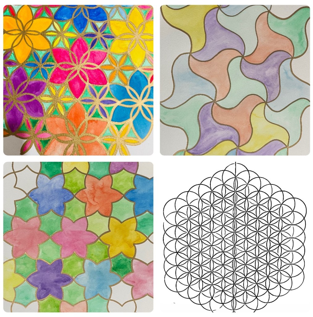I delivered the ‘Flower of Life’ pattern in the online class. As well as compass practise, we hunted and created more patterns that can be formed using the Flower of Life as a grid.